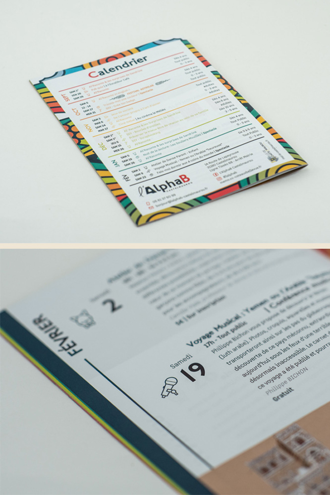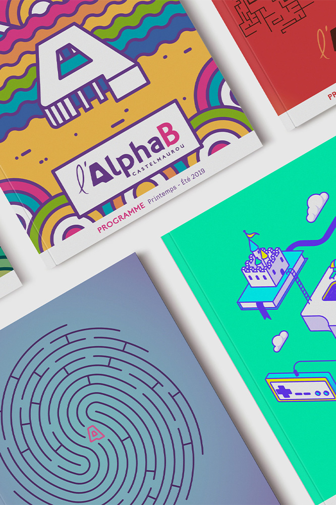 La médiathèque de Castelmauroux m'a contacté pour réaliser leurs programmes semestriels. Nous avons aussi travaillé à un set de pictogrammes pour l'étiquetage des livres, jeux, CD, films disponibles sur le lieu.